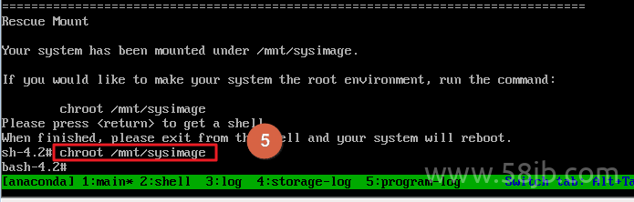 5、进入单用户模式后会提示切换到根目录,需要执行命令 chroot /mnt/sysimage