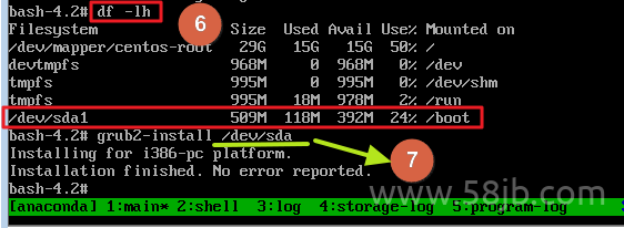 6、当切换根目录后可以看 shell 环境变化,从 sh-4.2 变成了 bash-4.2 ,然后找到/boot分区挂载的磁