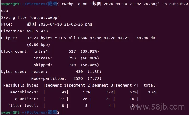 -q 80:质量 80(推荐 70–90,越小体积越小)input.jpg:原图-o output.webp:输出文件名