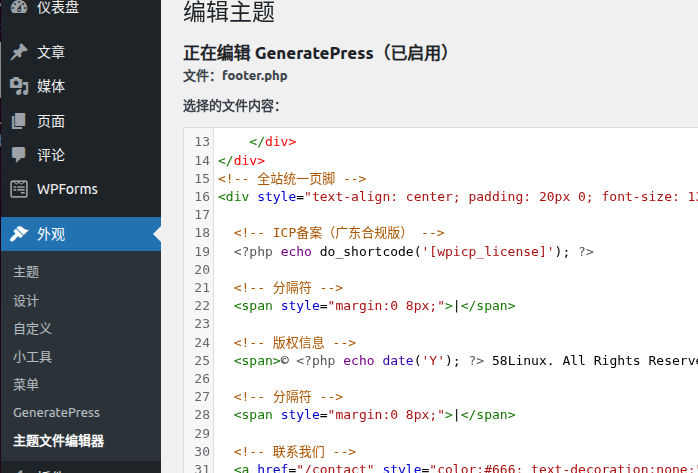 大多数国内主题都有 “页脚→备案号” 选项,不用代码。就是上图那个界面就是通过主题文件编辑器来修改的,并不是自己去服务器找到footer.php修改,但是里在不安装上面的插件,即直接在这个文件里加入我们准备的代码即可。